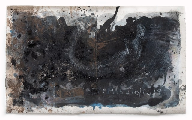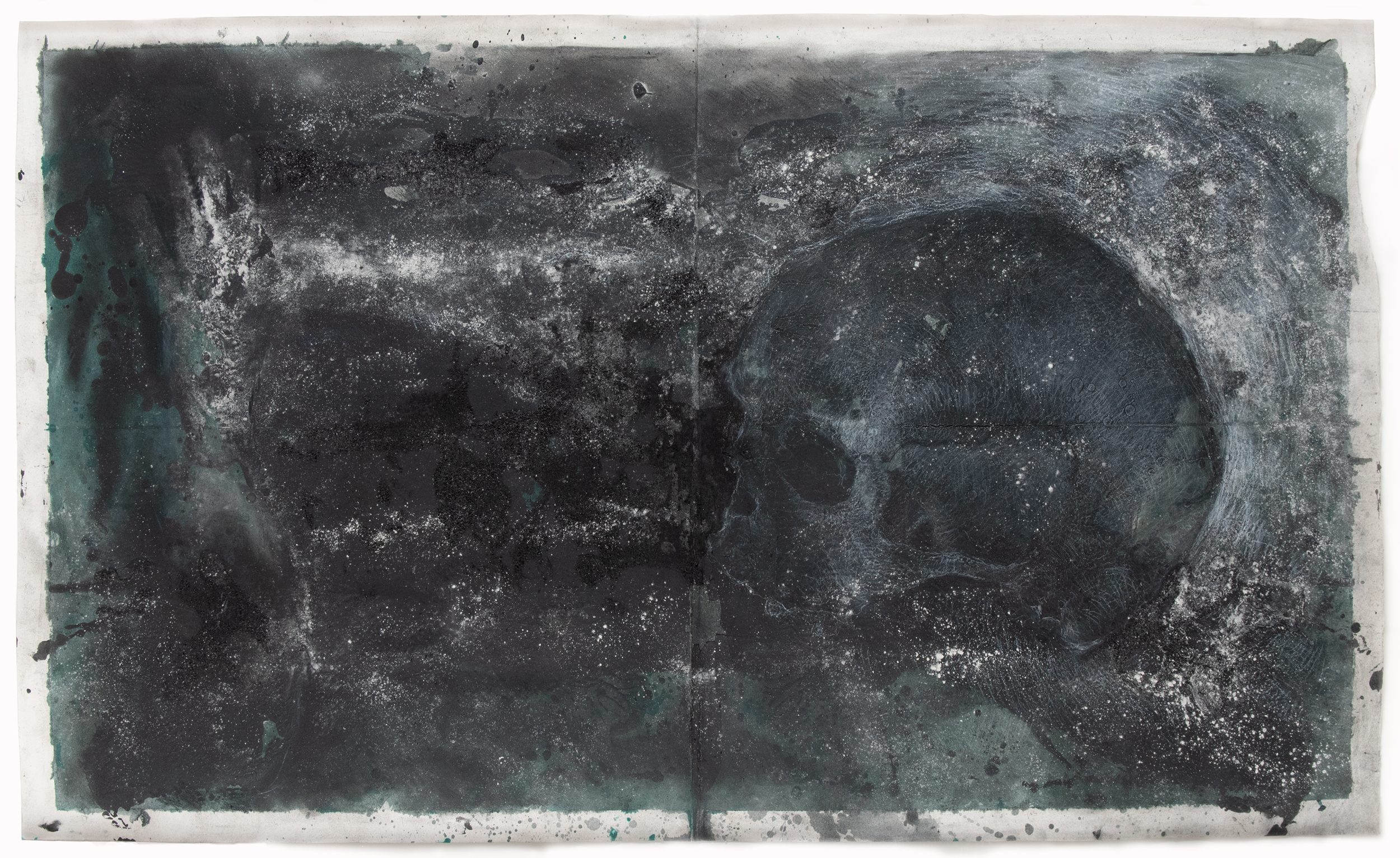 I employ a broad range of mark-making techniques including body prints, collage, drawn marks and the layering of multiple materials (blackboard paint, soil, builders chalk, oxides, twigs and leaves, charcoal and burnt ashes). Together these layered material surfaces and marks generate delicate, performative renditions of the human skull that, from afar, appear near ethereal and ghostlike, much like X-rays. In this way the works become self-contradictory, visually uniting the material and the immaterial (or spiritual) in the singular: once the viewer steps closer the image a disappears in a haze of near painterly layers and gestural marks, revealing its deeply material constitution. Moreover because the work is completed on blackboard paint it signals the possibility of provisionality and easy erasure – things appear and disappear indeed.