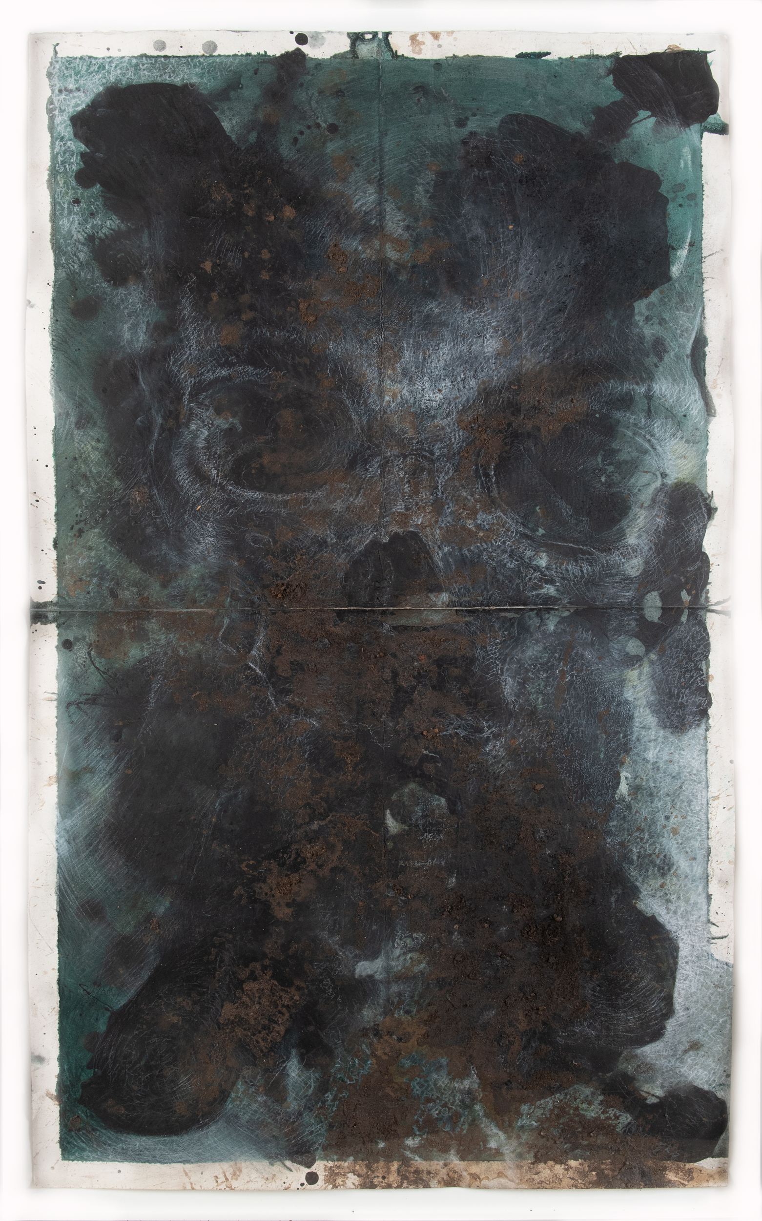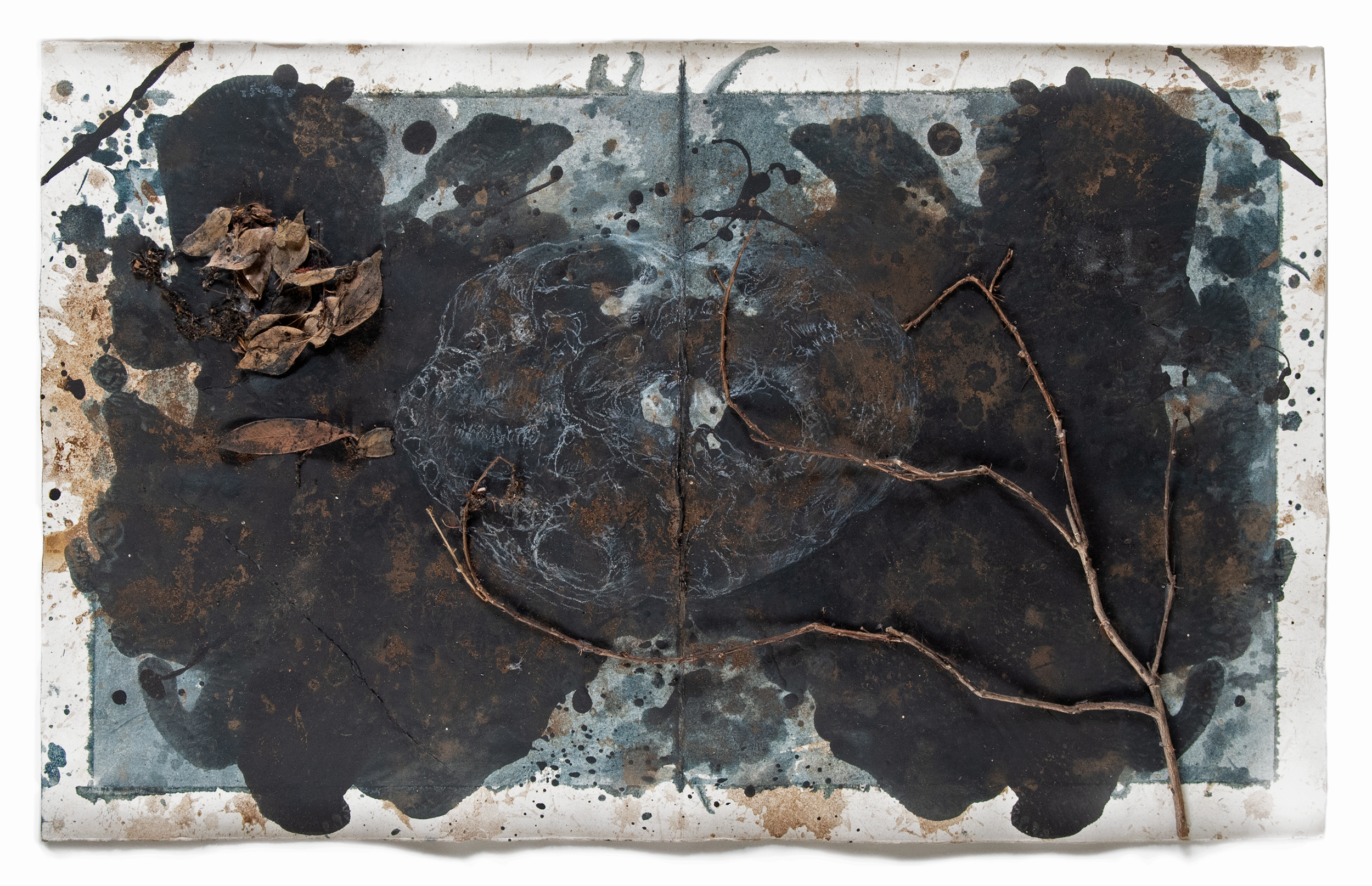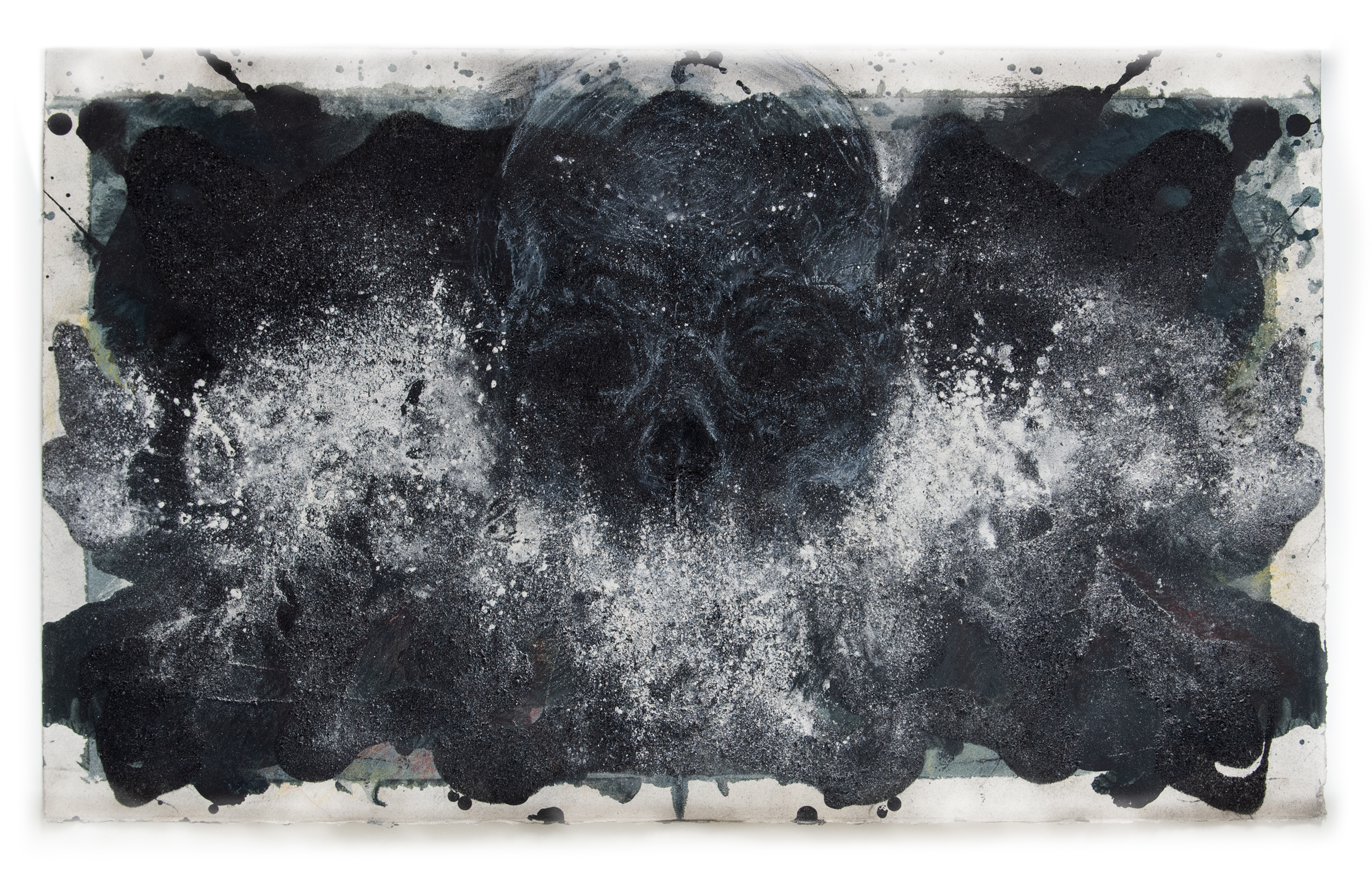 I employ a broad range of mark-making techniques including body prints, collage, drawn marks and the layering of multiple materials (blackboard paint, soil, builders chalk, oxides, twigs and leaves, charcoal and burnt ashes). Together these layered material surfaces and marks generate delicate, performative renditions of the human skull that, from afar, appear near ethereal and ghostlike, much like X-rays. In this way the works become self-contradictory, visually uniting the material and the immaterial (or spiritual) in the singular: once the viewer steps closer the image a disappears in a haze of near painterly layers and gestural marks, revealing its deeply material constitution. Moreover because the work is completed on blackboard paint it signals the possibility of provisionality and easy erasure – things appear and disappear indeed.