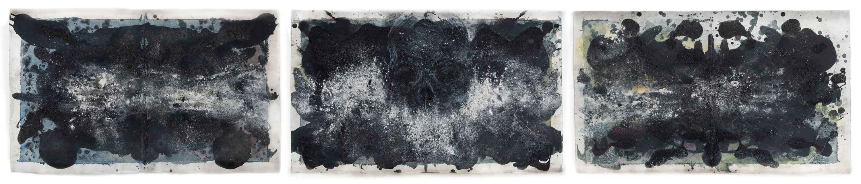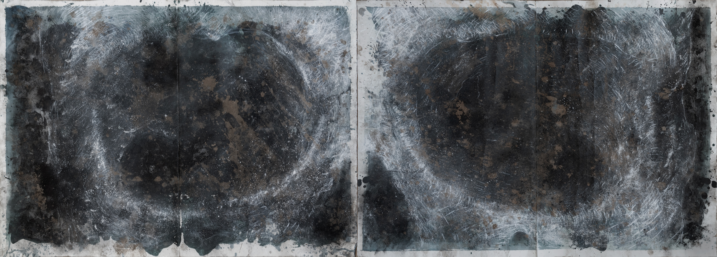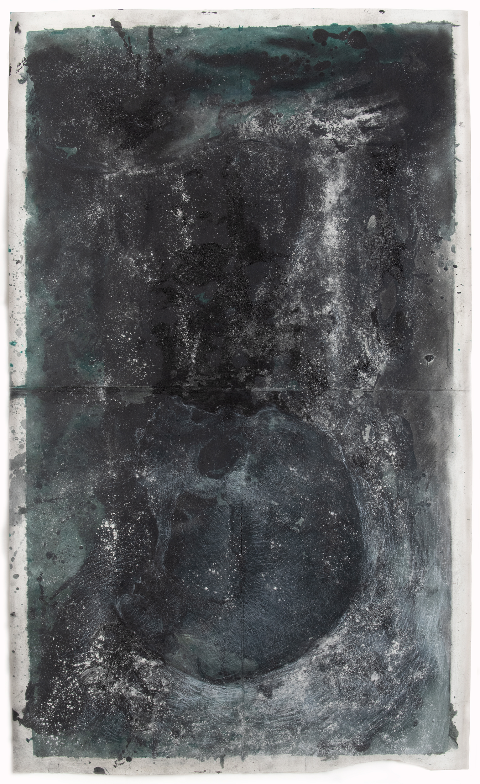I employ a broad range of mark-making techniques including body prints, collage, drawn marks and the layering of multiple materials (blackboard paint, soil, builders chalk, oxides, twigs and leaves, charcoal and burnt ashes). Together these layered material surfaces and marks generate delicate, performative renditions of the human skull that, from afar, appear near ethereal and ghostlike, much like X-rays. In this way the works become self-contradictory, visually uniting the material and the immaterial (or spiritual) in the singular: once the viewer steps closer the image a disappears in a haze of near painterly layers and gestural marks, revealing its deeply material constitution. Moreover because the work is completed on blackboard paint it signals the possibility of provisionality and easy erasure – things appear and disappear indeed.