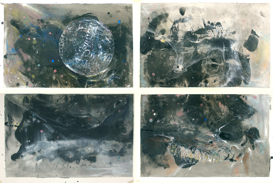 I first splattered the sheets of white paper with large drips of paint. I then folded the sheets both vertically and horizontally to create something shapes that Rorscharch patterns. These surface marks would constantly remind me of my own relationship to the subject matter of the work and its meaningful interpretation. On another level the thick blobs of paint itself is for me suggestive of the skin of an elephant – with the fragile drawn, white lines forming something like the boney armiture that holds it together. Moreover, I was careful not to overwork the drawings as I wanted the fragility of the image, its relative ‘lightness’, to retain its intrigue. These works suggest something like an impression, a fleeting presence captured in the moment.