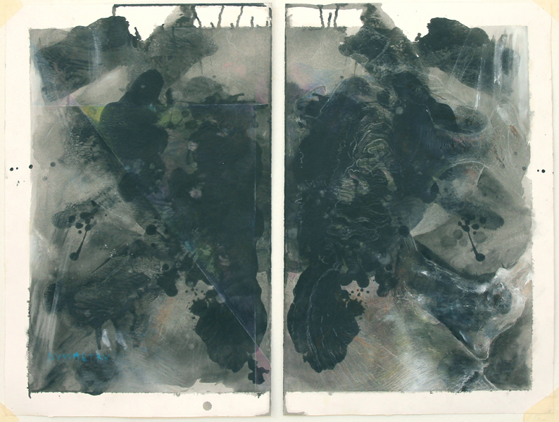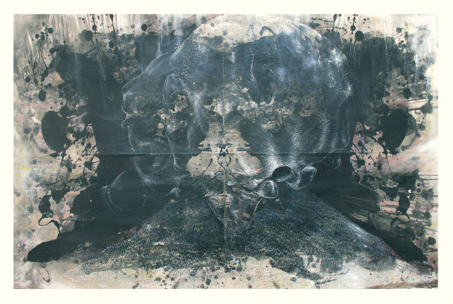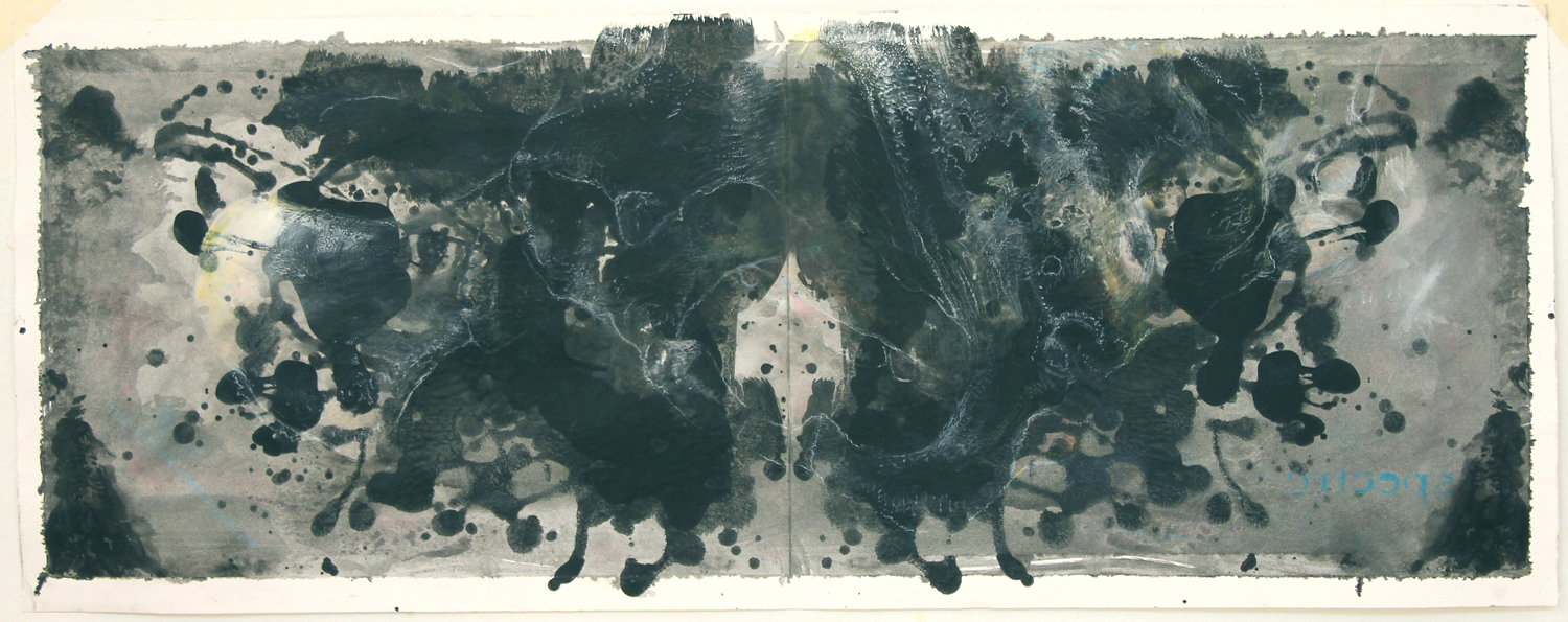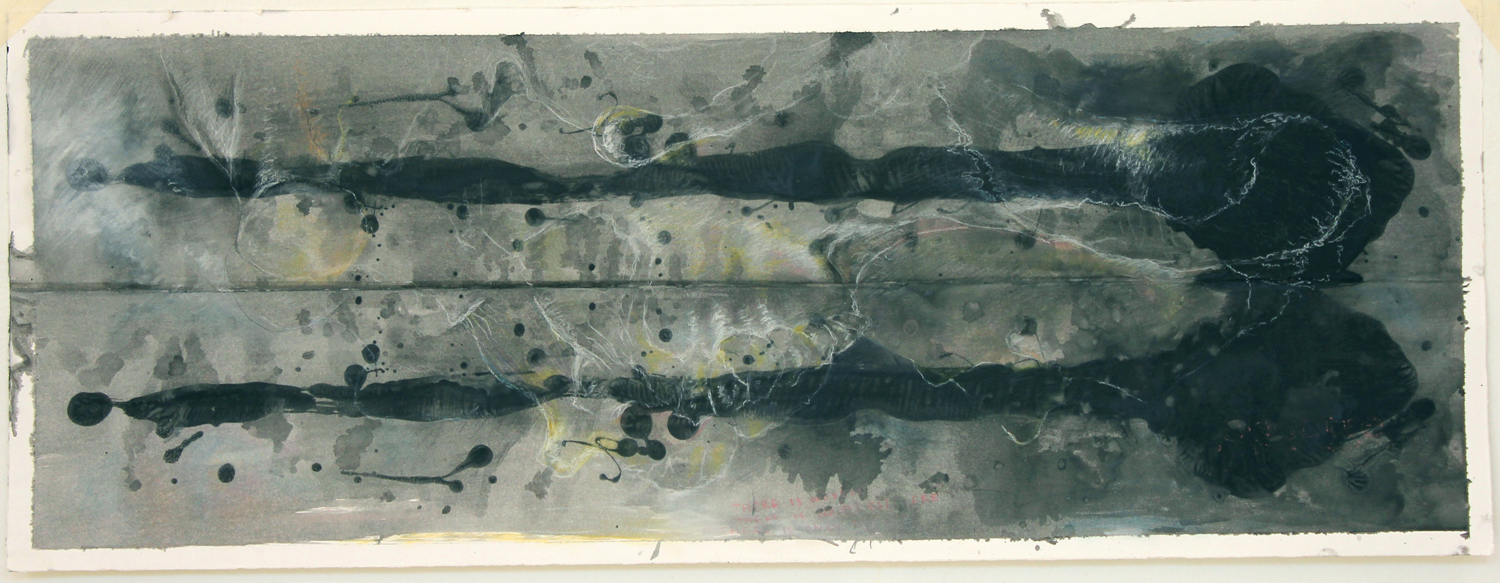 I first splattered the sheets of white paper with large drips of paint. I then folded the sheets both vertically and horizontally to create something shapes that Rorscharch patterns. These surface marks would constantly remind me of my own relationship to the subject matter of the work and its meaningful interpretation. On another level the thick blobs of paint itself is for me suggestive of the skin of an elephant – with the fragile drawn, white lines forming something like the boney armiture that holds it together. Moreover, I was careful not to overwork the drawings as I wanted the fragility of the image, its relative ‘lightness’, to retain its intrigue. These works suggest something like an impression, a fleeting presence captured in the moment.