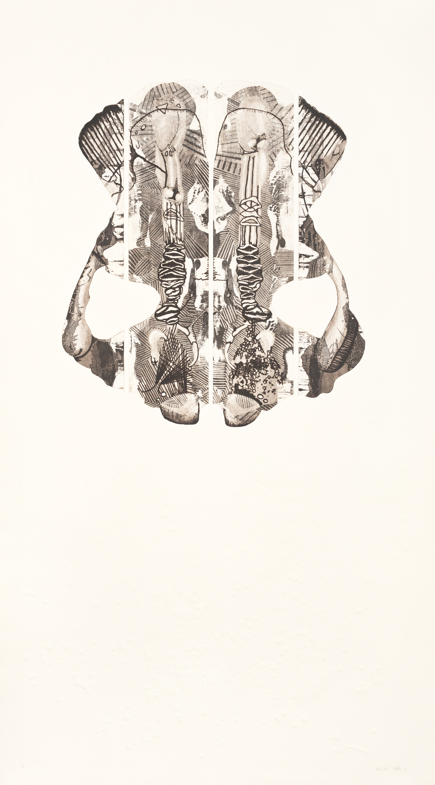 Embossed body print in white by Johan Thom with etching by Bevan De Wet