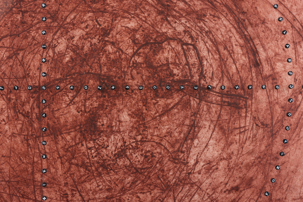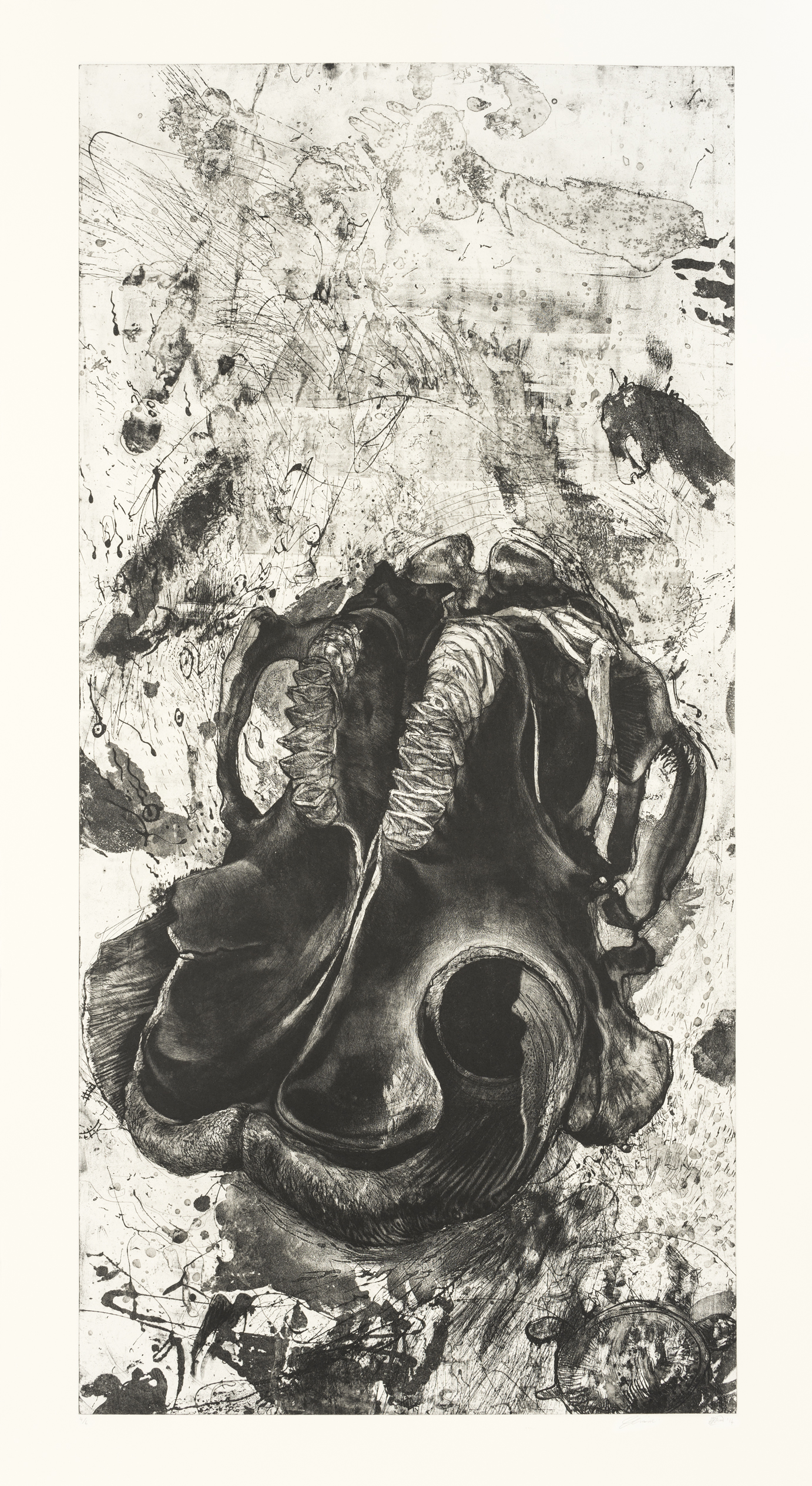 For this leg of the project Johan Thom collaborated with a number of artists to produce works that address the encounter with the elephant skull and each other. Thom prepared the etching plates specifically keeping in mind the work of the collaborating partner. Once the plates were prepared the artists were invited to come spend some time viewing, drawing and photographing the elephant skull at the Nirox Foundation. For example in the case of the work of Willem Boshoff Thom prepared scratched the copper etching plate with the elephant skull, spinning it atop the mirror like, yellow surface for a number of hours. In turn Boshoff overlaid the printed image with a target such as may be found on a hunting rifle. However in keeping with his linguistic approach to artistic practice Boshoff used a number of small, black three dimensonal plastic letters to construct the shape. For the Diane Victor’s print Thom made a full body print by covering himself in condensed milk and crawling across the plate. At this point Victor responded in her signature realist style, drawing the skull in immaculate detail atop the ghostly human figure.