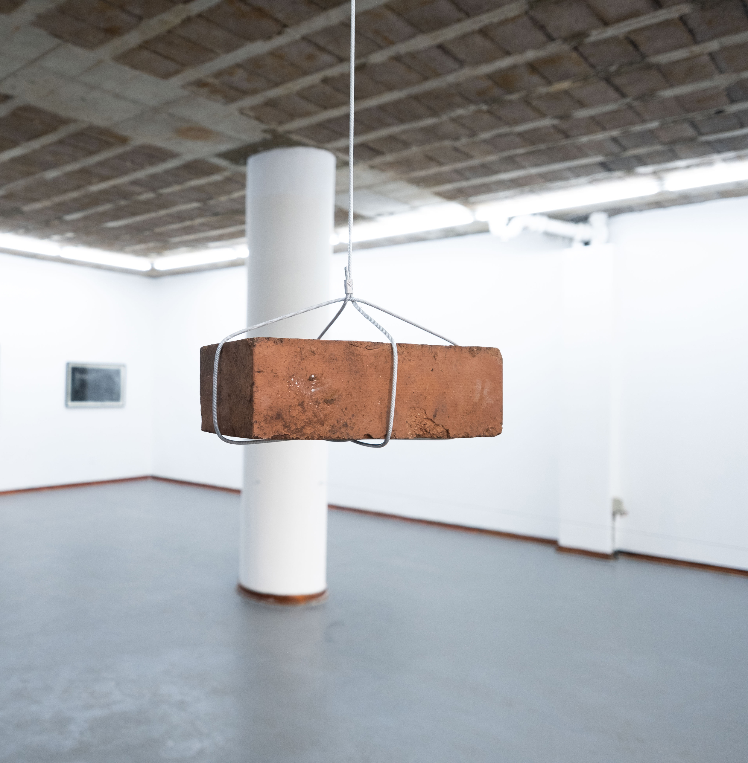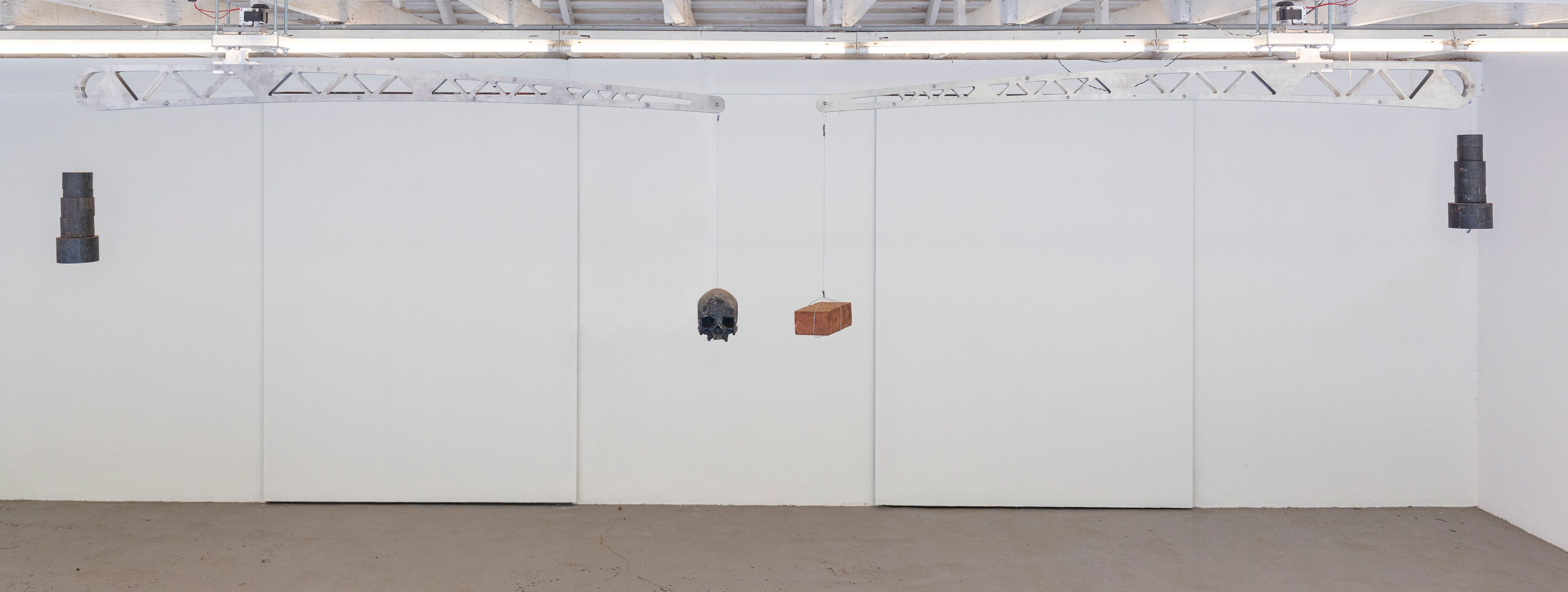The central sculptural installation, Time after time (2023) features a brick and a bronze replica of a human skull mechanically automated to swing through the gallery space in a circular motion. The two objects fill the room as they float through the air, nearly colliding as they pass each other. This formal conceit sets in motion a series of conceptual associations with the passing of time, progress and the ever-present reality of violence and death in South Africa. The countless memories of loss, violence and trauma historically written into human bodies become a dormant repository of energy that may yet be unleashed upon the world. Throughout the exhibition, Thom will enter the the sculptural installation as part of a series of live performances or ‘lesser miracles’.