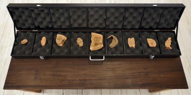 The title of this artwork is Grasp (2024) by Johan Thom and it was produced specifically for exhibition at the Nirox Sculpture Park in the Cradle of Humankind, Kromdraai, South Africa. The artist made each form inside the box by taking a piece of wet clay in his hand and closing his hand around it with varying amounts of pressure. The clay shapes were then dried and baked in a kiln.