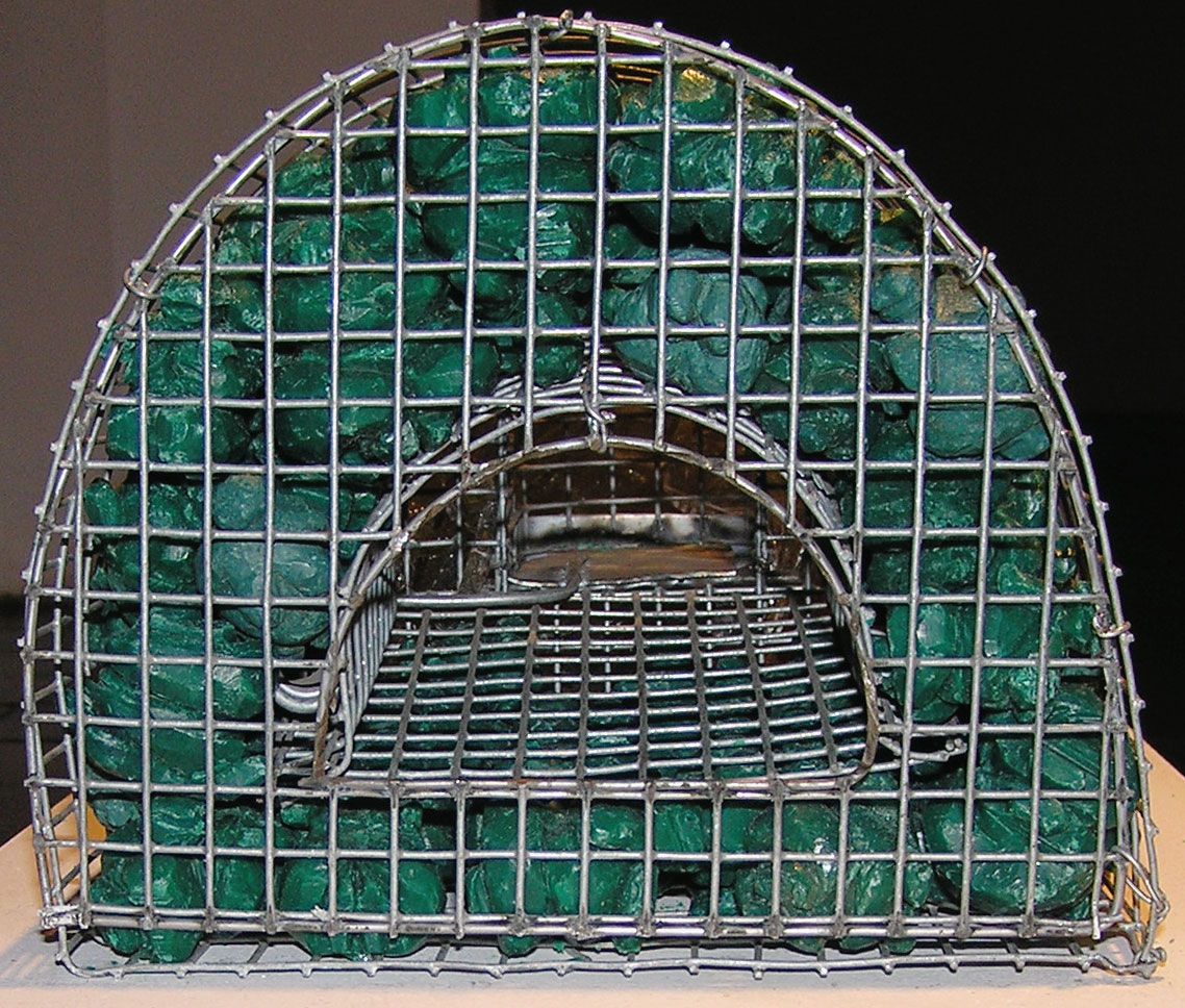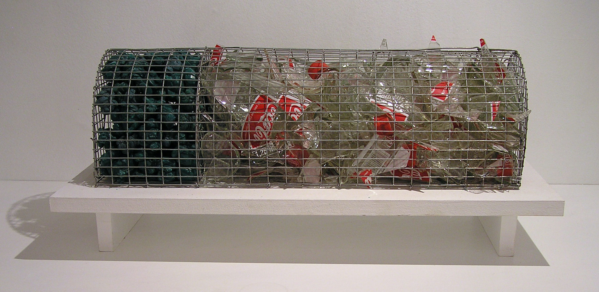 The broken glass of 12 Coke bottles (1.5l each). The artist consumed it in 3 days (6 litre per day) whilst fasting. These bottles were then broken in order to fit into the larger interior section of the rat-trap.