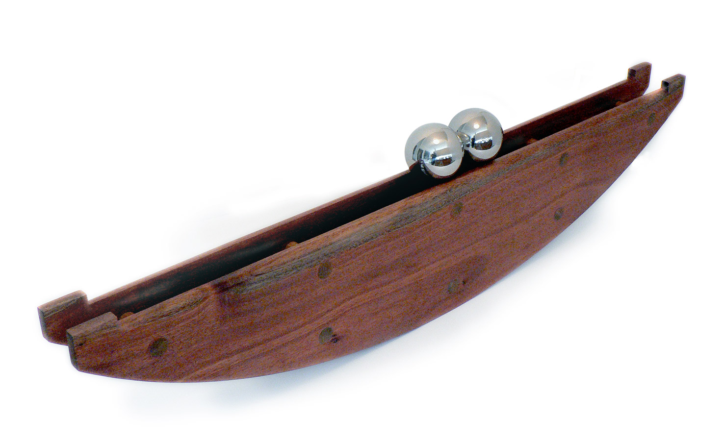 The artwork is perfectly balanced and, if touched, each orb moves freely atop the ‘tracks’ created by the two wooden side sections, with the entire vessel rocking gently from side to side. Thus, the words make a soft noise, ‘speaking’ or ‘whispering’ (in an entirely new audiological / linguistic form) when the orbs crash into one another as they periodically seperate and meet again.