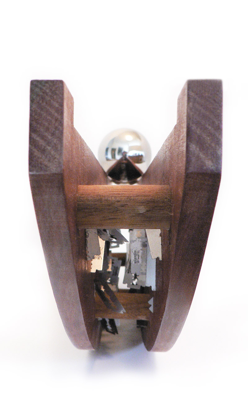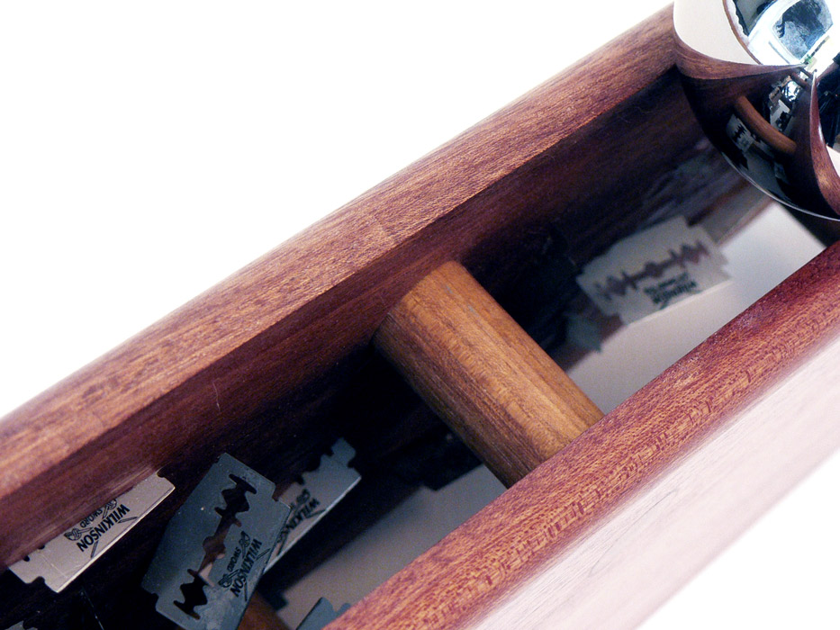 VESSEL: PERFECT LOVERS 2009, Wooden vessel, 110cm x 25 x 8.5cm. Polished Meranti Wood, hollow stainless steel orbs, razorblades, text.