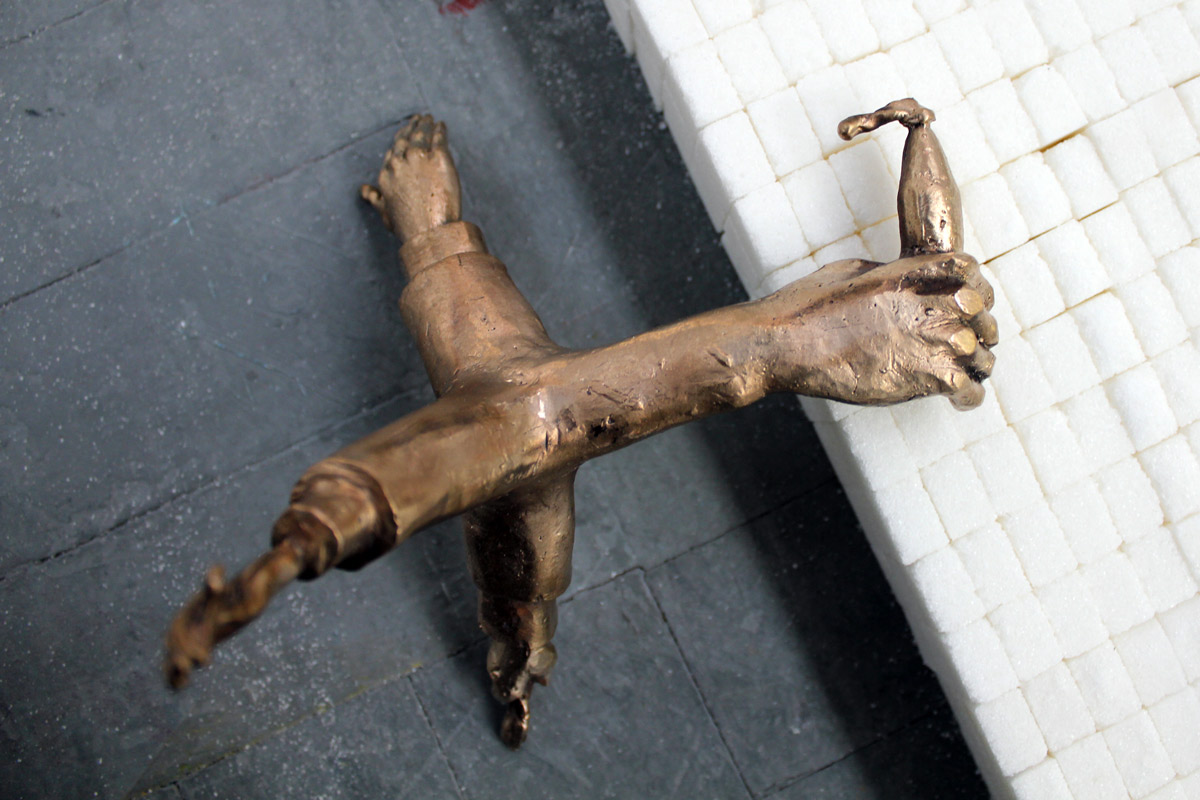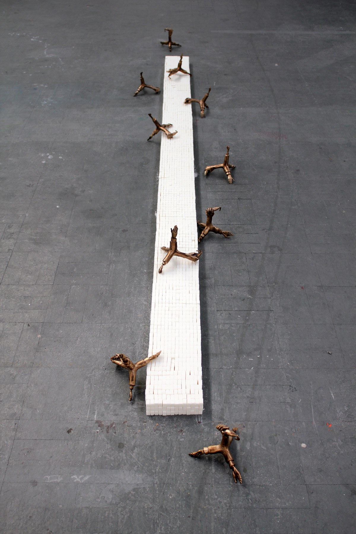 In the resulting artwork a number of cultural, political and aesthetic ideas are made brought forward through a combination of material, form and concept. Here custom made, bronze caltrops are combined with a barrier constructed from approximately 50 kg of tightly packed sugar cubes. A ‘caltrop’ is defined as an iron shape with four spikes placed so that one is always projecting upwards, thrown on the ground to impede cavalry horses. (Originally the meaning of the word derives from a plant which tended to catch or entangle the feet).The bronze caltrops were originally designed and cast by South African sculptor Guy Du Toit (in collaboration with Iaan Bekker). Each of the four spikes have been modified into a human hand engaged in a variety of iconic gestures – one points a gun, another holds a credit card and so forth.