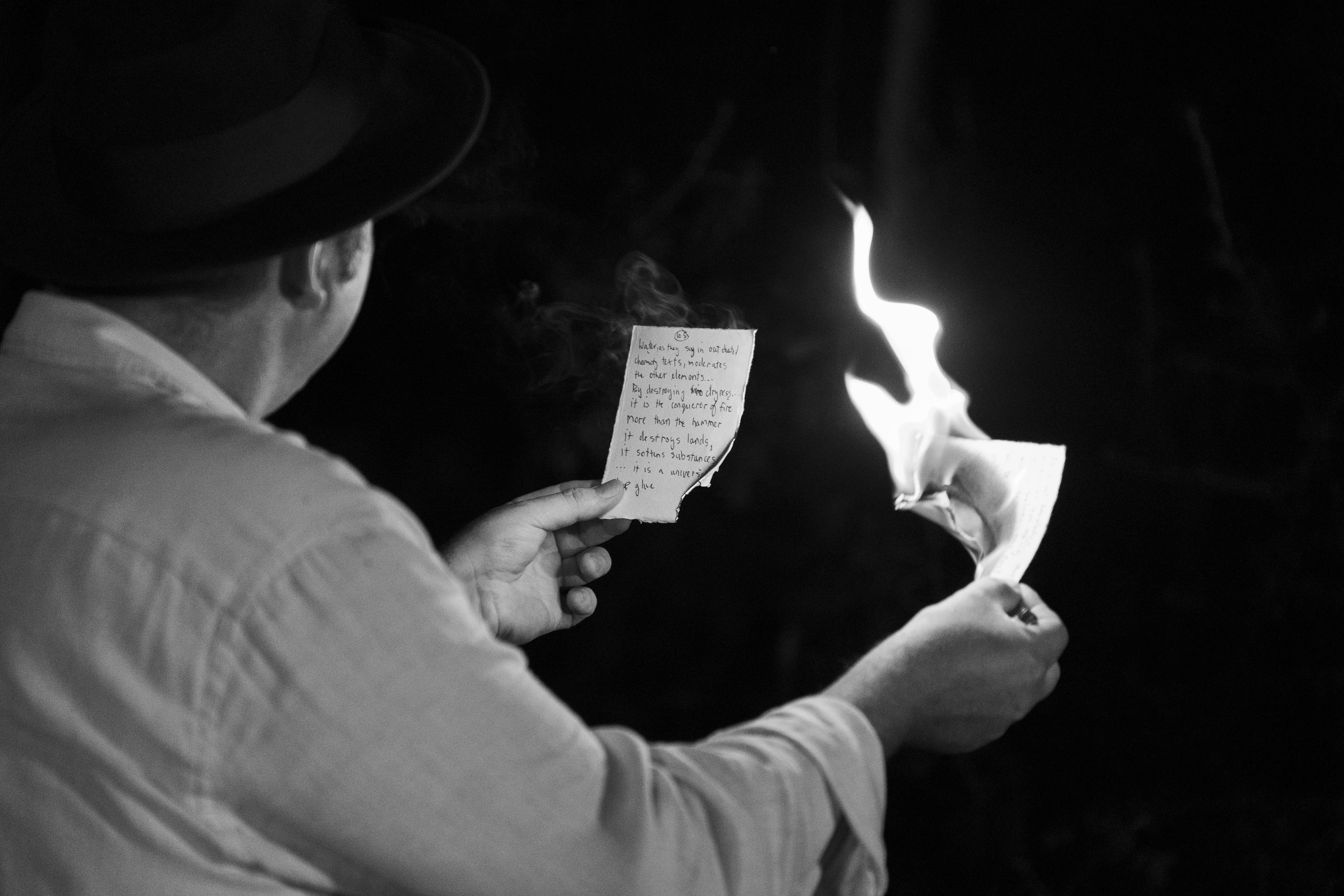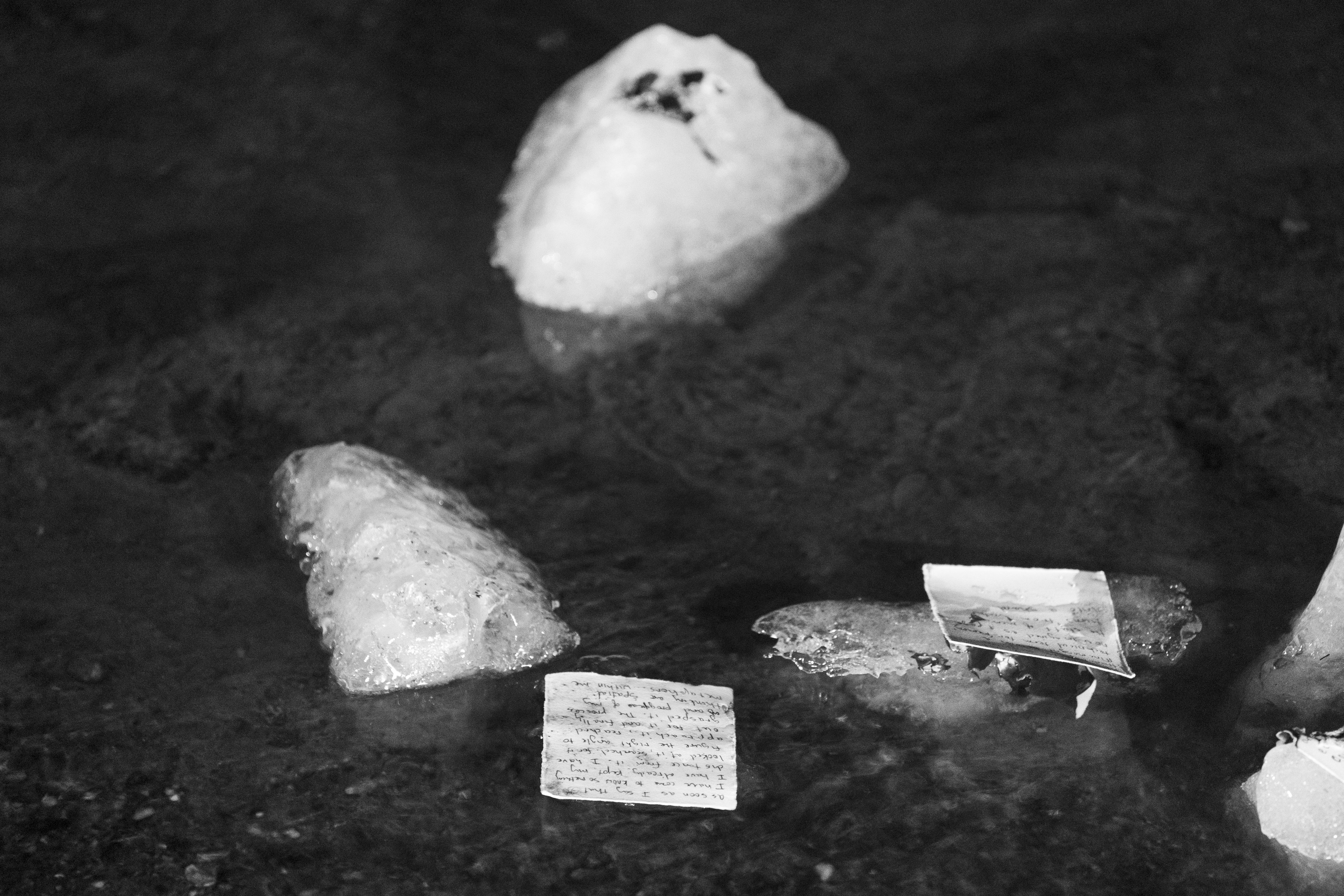 For this 10 minute site-specific performance to I recited a set of literary fragments sampled from two texts: Gaston Bachelard’s Water and Dreams and essay on the Imagination of Matter (1942), and Vladimir Illich’s H2O and the Waters of Forgetfulness: Reflections on the Historicity of ‘Stuff’ (1985). Each literary fragment was set alight as I read it and placed upon the melting blocks of ice placed in the natural spring.