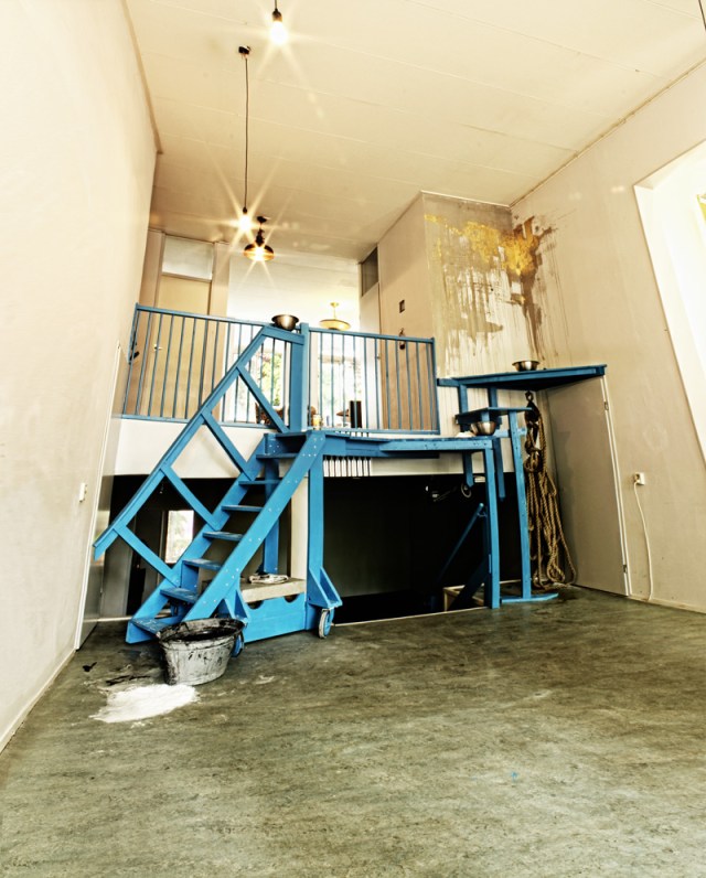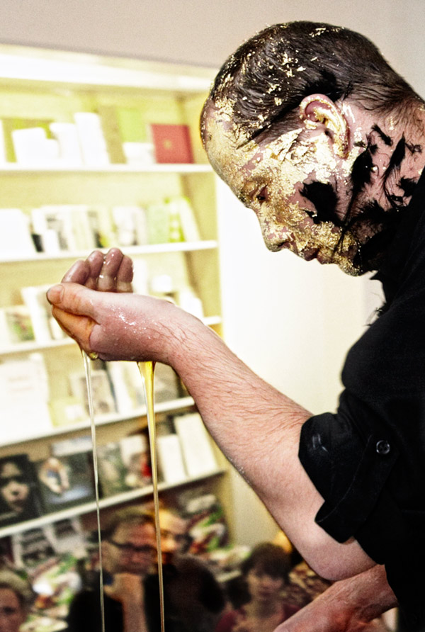 Production stills, FIGUREHEAD 2010, Performance. Wooden construction, 23 ct gold leaf, honey and text, crow feathers, rope, stainless steel bowls with honey and extra virgin olive oil, flour, found objects, water. 4 June 2010,