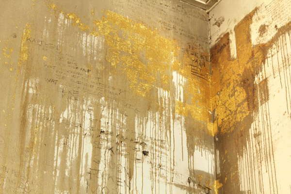 For the performance itself I repeated a sequence of events three times: First I washed my hands with water and salt. I then climbed the stairs towards the prow, collecting honey and oil in each hand that I would siphon off into a metal container on the small platform. During this process I would recite excerpts from the texts that I had written on the wall covered in honey and gold leaf. The honey and oil would become mixed and flow through a hole in the platform onto the large rope construction hanging directly below. Eventually the oil and honey started spreading on the gallery floor.