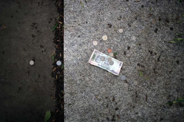FOUNTAIN Current UK minimum wage (£5.93) compiled from various international currencies and placed by the grave of Karl Marx in London: 104 Rupees, 4 Euros, 4 South African Rands , 1.71 British Pounds. It is possible to determine the exact date of the work using knowledge of the exchange rate in conjunction with that of the minimum wage.