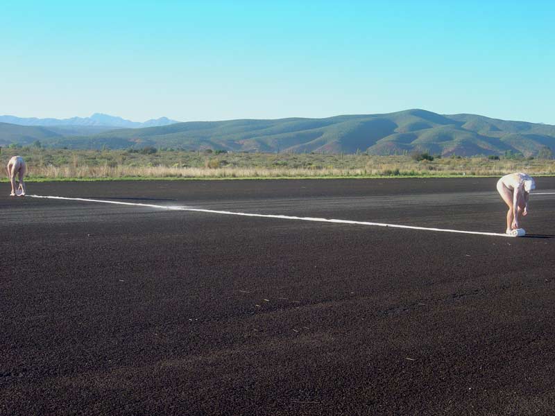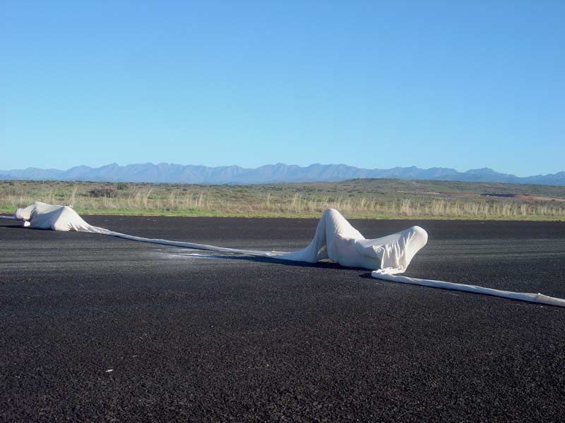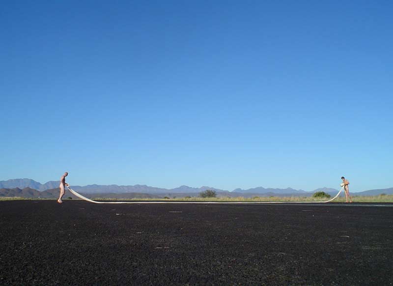 The artist towed a pickup truck/ ldv on a deserted dust road outside Oudsthoorn – dragging behind it a pile of rubbish (branches, plastic, rope – a disfigured effigy of sorts). At the time there was extensive media coverage of a criminal case where his employers and his fellow workers had dragged a farm worker to death behind a pickup truck. Sadly this was not an isolated incident – farm killings of both workers and their employers are commonplace in South Africa. It is also a known fact that a pickup truck or ‘bakkie’ as its commonly known in South Africa, is one of the most dangerous vehicles to own in SA as they are often violently hijacked and/or stolen.