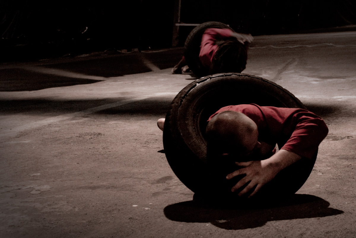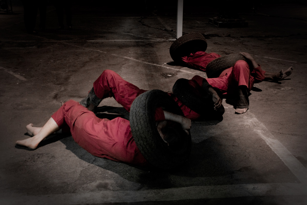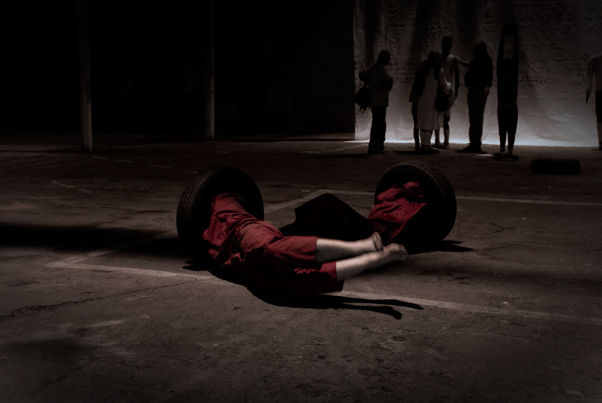 Medium: Performance with 4 performers, rubber tyres, red overalls, Duration: 60 Minutes