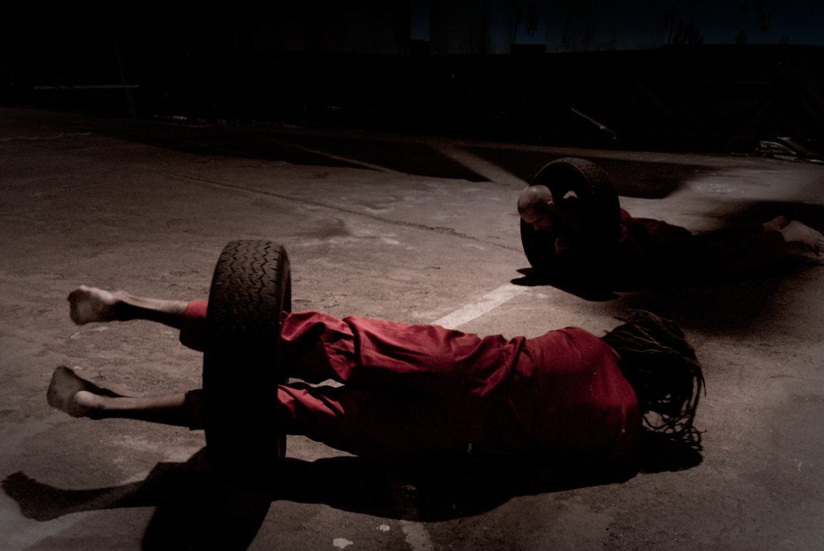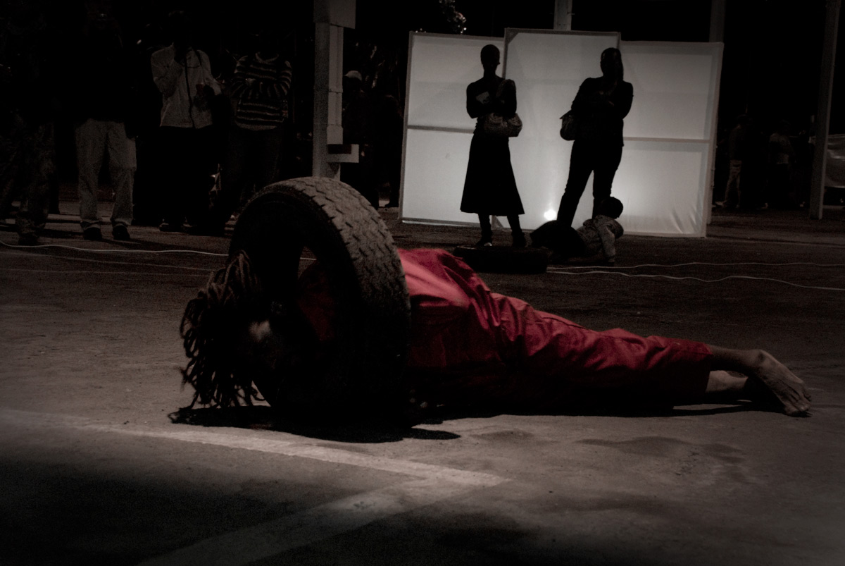 “For ‘Traffic’, Thom conceptualized a hard-hitting group performance, appropriating what is possibly one of the most infamous practices of community ‘justice’ and punishment from the mid 1980s-1990s in South African political history, namely ‘necklacing’. In short necklacing refers to the practice of filling a rubber tyre with gasoline, placing it around someones neck and setting it on fire. Necklacing in South Africa became a fairly commonplace practice during the turbulent 1980s when numerous traitors (informers for the erstwhile Apartheid government) and criminals were sentenced to death by informal community courts operating in the black townships. In 2008 during the South Africa once again saw a resurgence of the practice during the violenent protests against illegal Zimbabwean immigrants. Ironically, rubber tyres are also commonly used as toys by children – as homemade swings, for example.