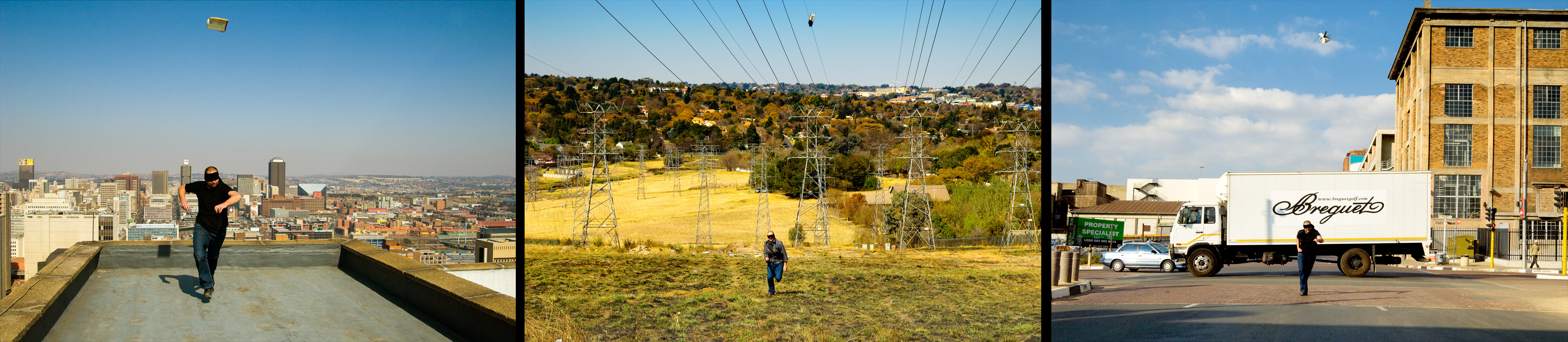 The artist is blindfolded. He throws a book into the air and rushes forward not knowing where the book will fall. The action is repeated in three different locations in Johannesburg with three different books respectively: