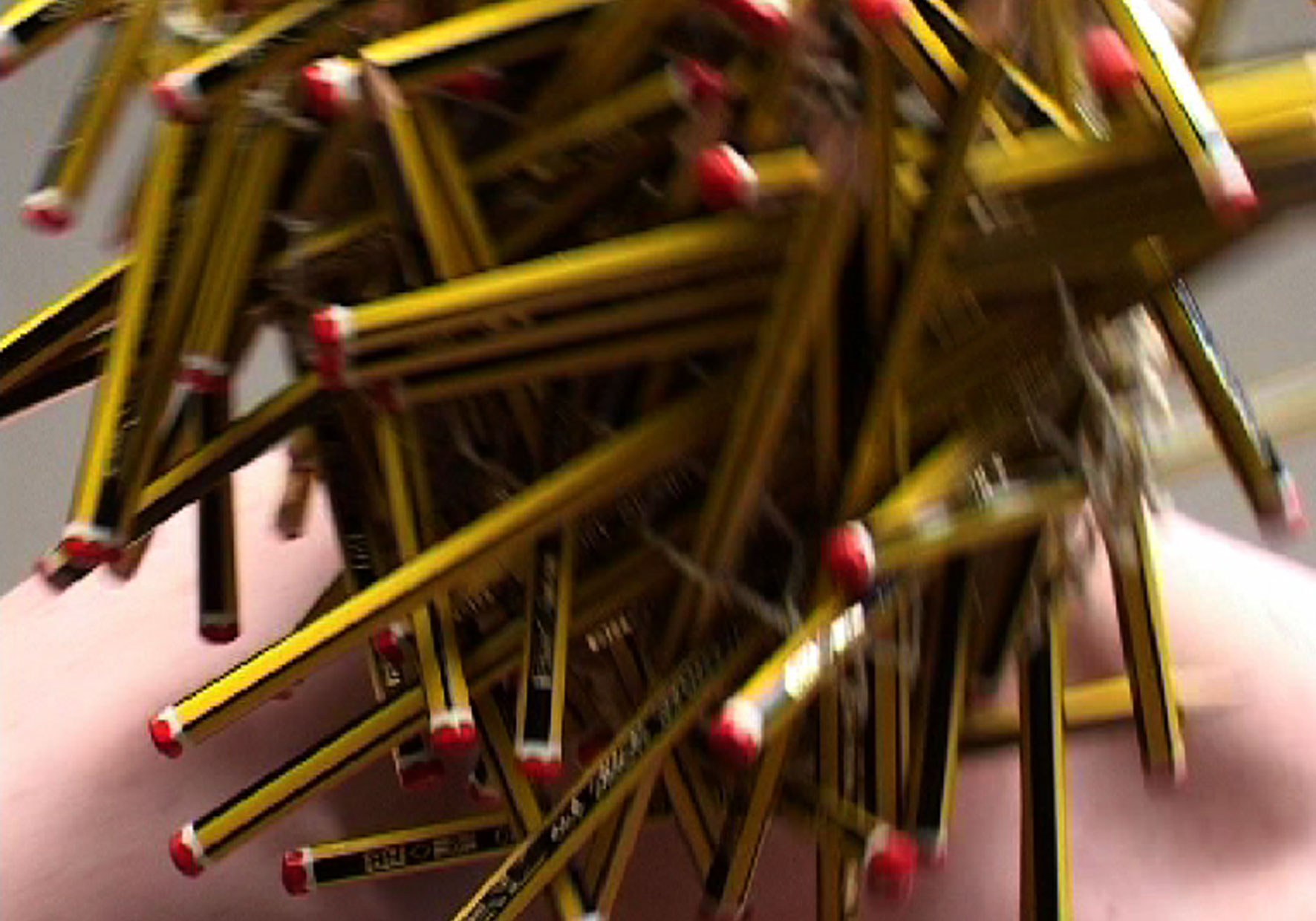 A pencil is in itself a loaded symbol: in art it is used to make drawings/ pre-sketches; in the education system it is normally given to young children to use when they start writing. Its marks are easily erasable and as a medium it is cheap and widely available. Also, it is rarely used to make ‘final marks’ – it is seen as being transient and for the most part not used as a serious art medium.