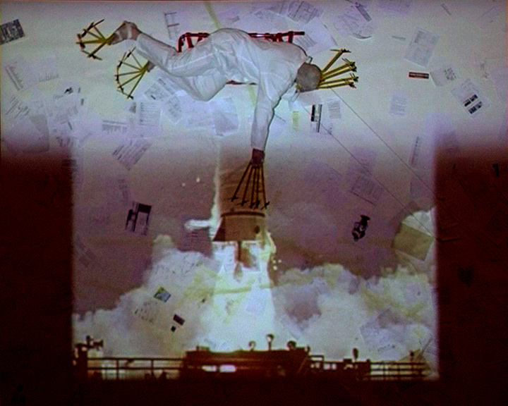 In the work Thom confronts us with a narrative loosely structured around the search for human progress and perfection during the twentieth century. Thom appears dressed in white, with yellow rulers extending from both his hands and feet. Like a virus, he then inserts himself into this narrative of simultaneous progress and destruction. For example, in a series of shots depicting the disastrous failure of the US government to launch its first space rockets into orbit, Thom suddenly appears floating directly above the launch pad, destroying the rockets by punching, kicking or even scratching them. In other sequences he appears to be flying above the urban landscape of contemporary Johannesburg, or joining a procession of marching rulers, and even magically raising the dead from a post-apocalyptic field of skulls and bones. Nonetheless the consequences of his actions are both humorous and tragic: his mischief is that of a court jester who playfully reminds humanity of its shortcomings, failures, illusions of grandeur and frailty.