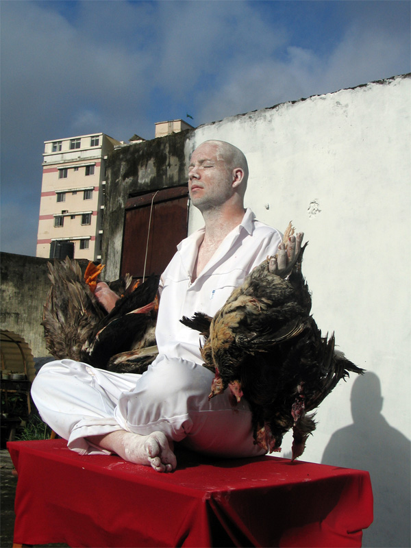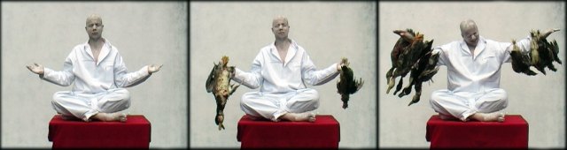 In the video Thom’s arms are progressively weighed down with the carcasses of recently slaughtered chickens and ducks until he can no longer bear the added weight and in a desperate attempt to maintain his equilibrium, he then attempts to fly by using his arms as wings.