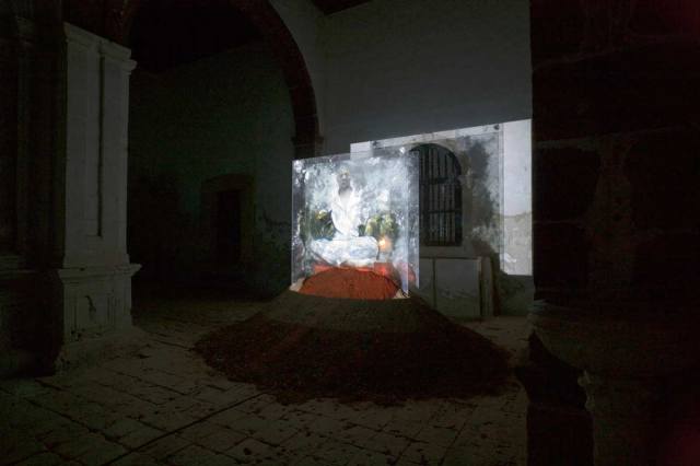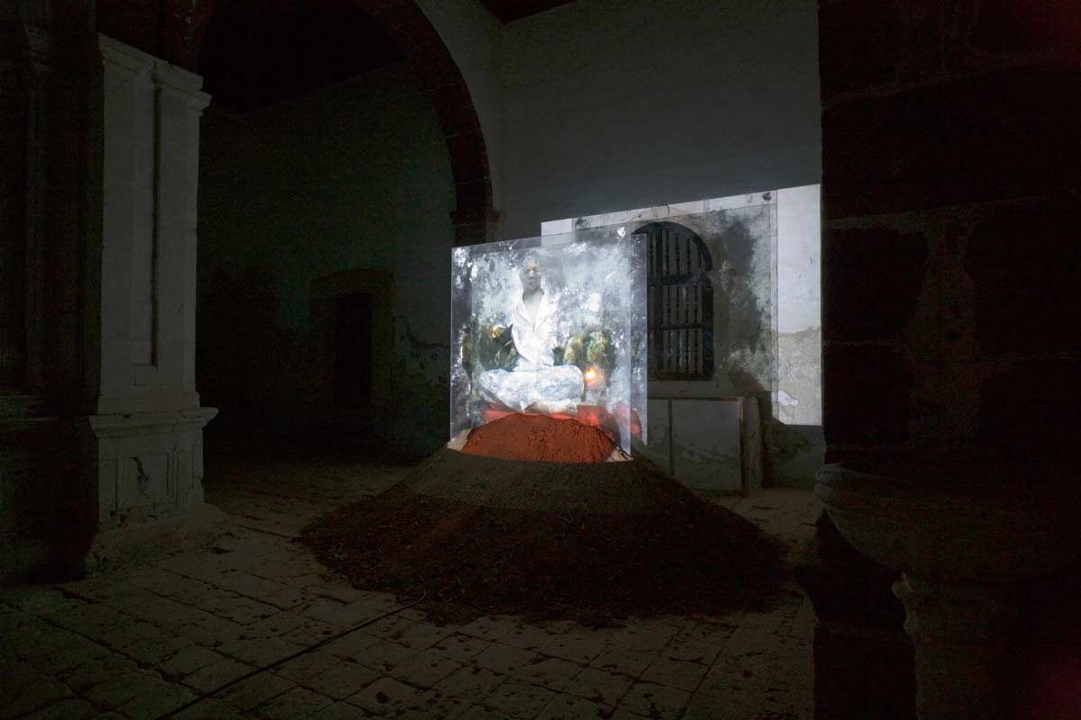 A work that was produced whilst the artist was on residence at the Britto Arts Trust (a part of the Triangle Trust) in Dhaka, Bangladesh during 2006. The work is wry commentary on the failures and successes of humanities search for mental and spiritual enlightenment. A 10 minute video loop of the artist sitting and meditating in a pose reminiscent of Buddha is projected onto the physical installation (which is comprised of a massive heap of soil out of which two large glass plates protrude). To the viewer it seems as if they are in the presence of a ghostly apparition floating just above a small mountain of soil.