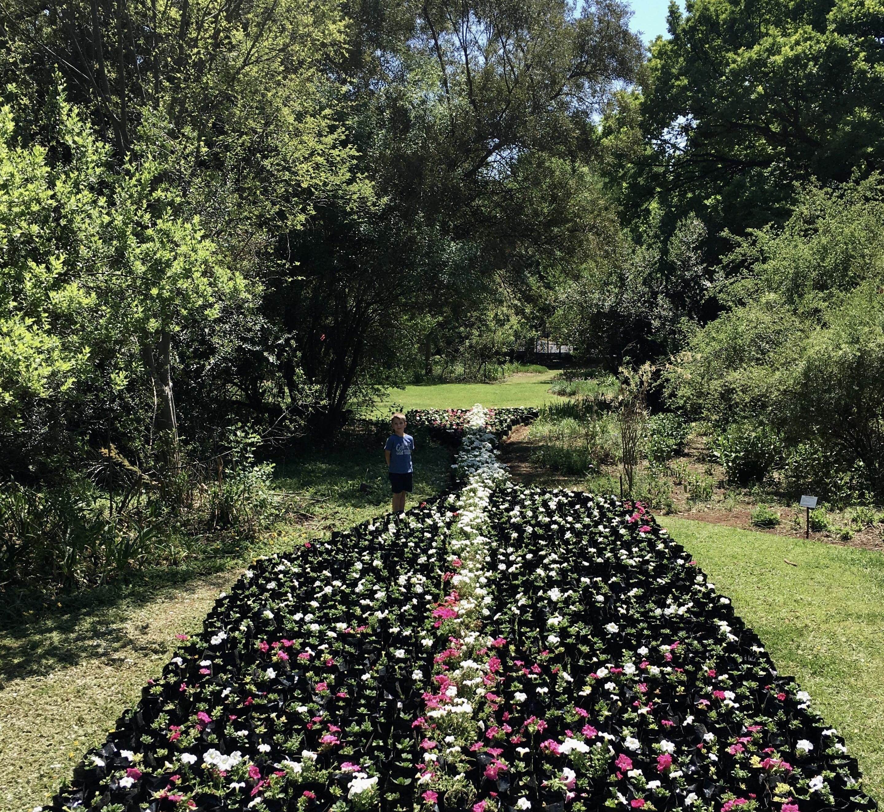 Image credit: Olu Oguibe, installation view of ‘Pink and White Flowers’ (2018), a site specific installation at the NWU Botanical Gardens, Potchefstroom, South Africa.